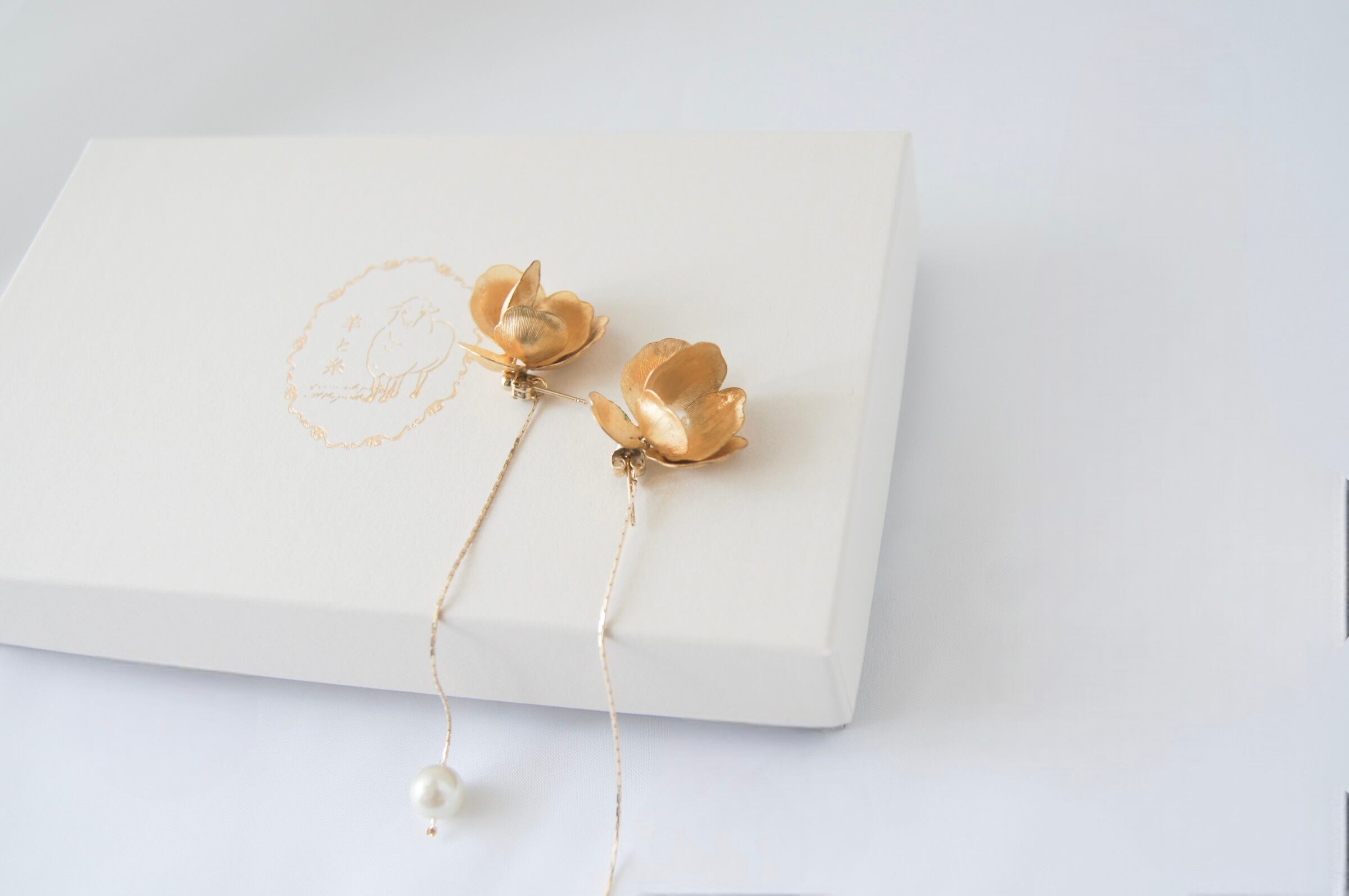 大人コーデ デイリーアクセサリー パールアクセサリー 揺れるイヤリング チェーンイヤリング マタニティフォト 女の子 チェーンアクセサリー 和装 真鍮アクセサリー 真鍮イヤリング 真鍮ピアス 真鍮フラワー 花びら 華奢ピアス