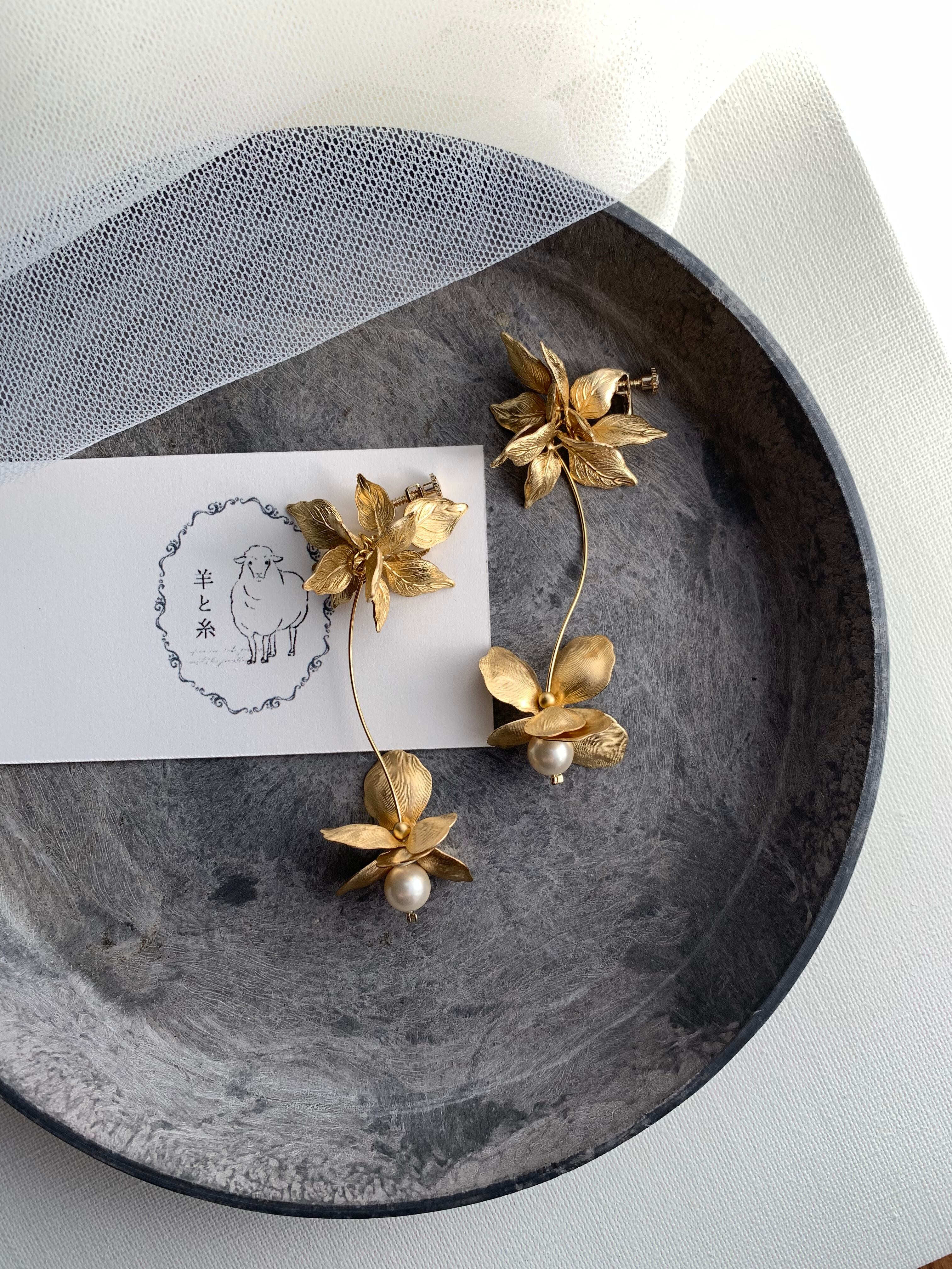 大人コーデ 大ぶりアクセサリー 淡水パールアクセサリー ビーズアクセサリー フラワーピアス フラワーイヤリング フラワーアクセサリー ゴールド 花嫁アクセサリー 揺れる