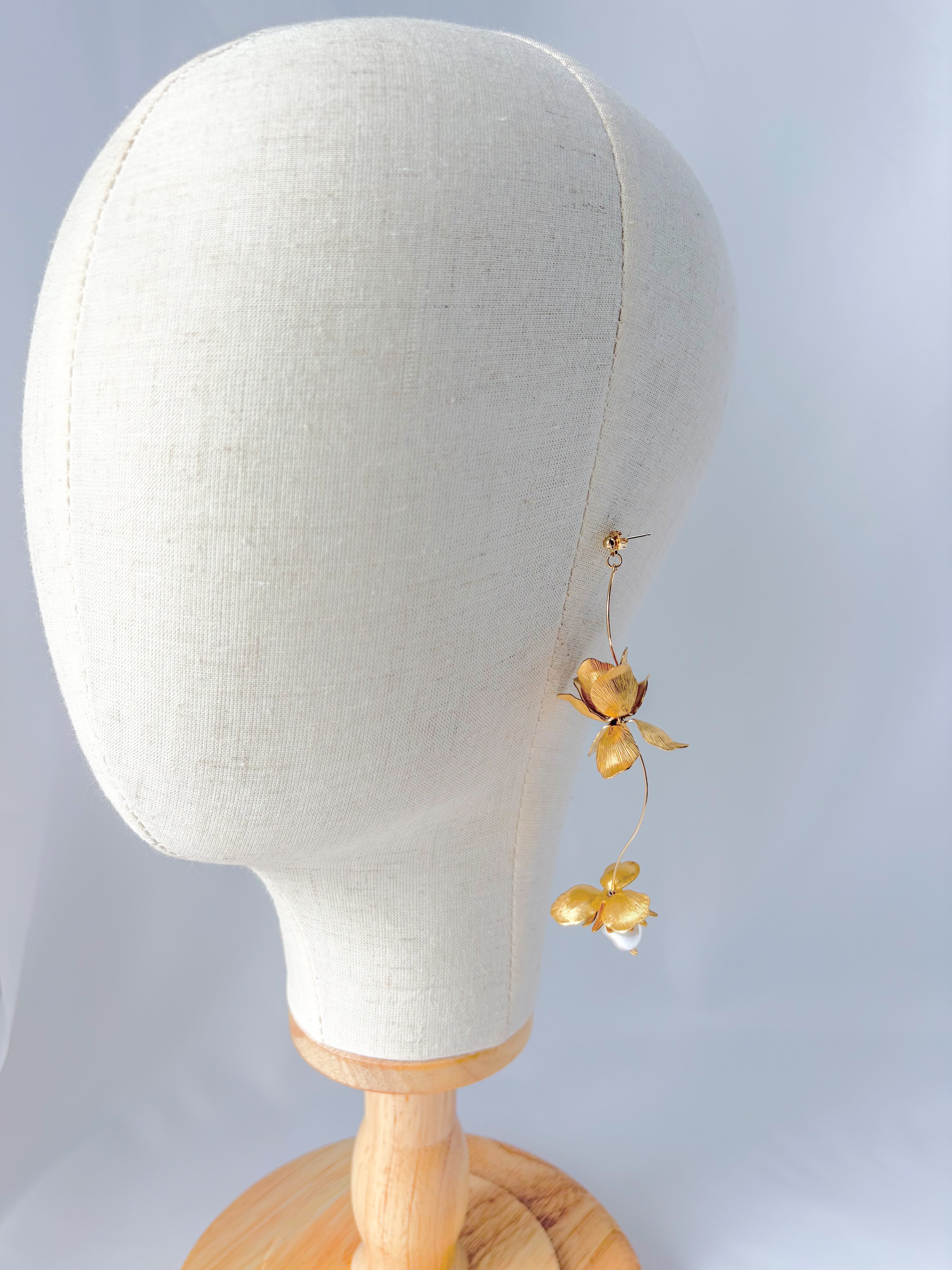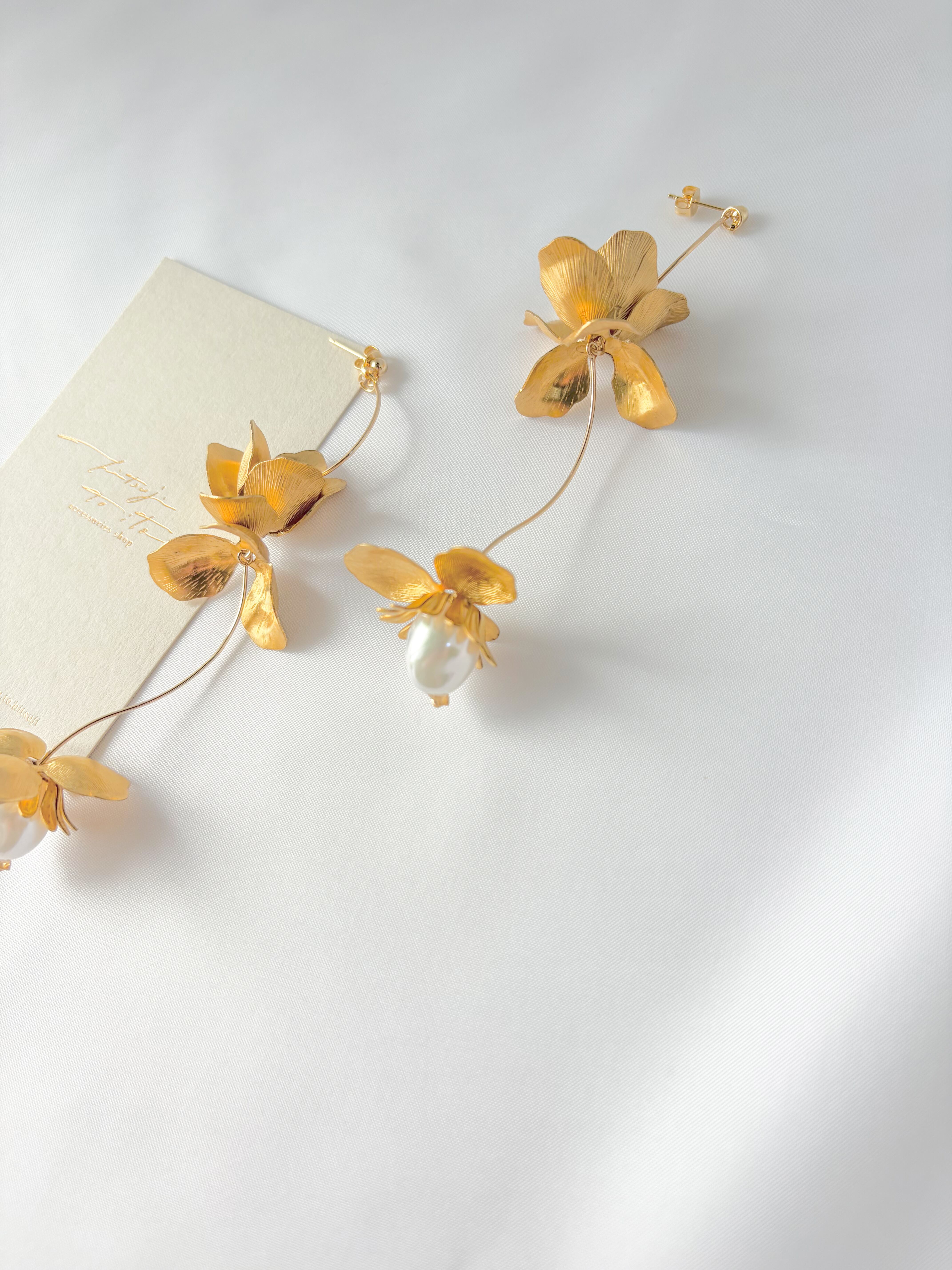 ゆらゆらと揺れる真鍮フラワーの1番下には大粒バロックパールが入っており、華奢でとっても可愛いらしい作品になりました◌