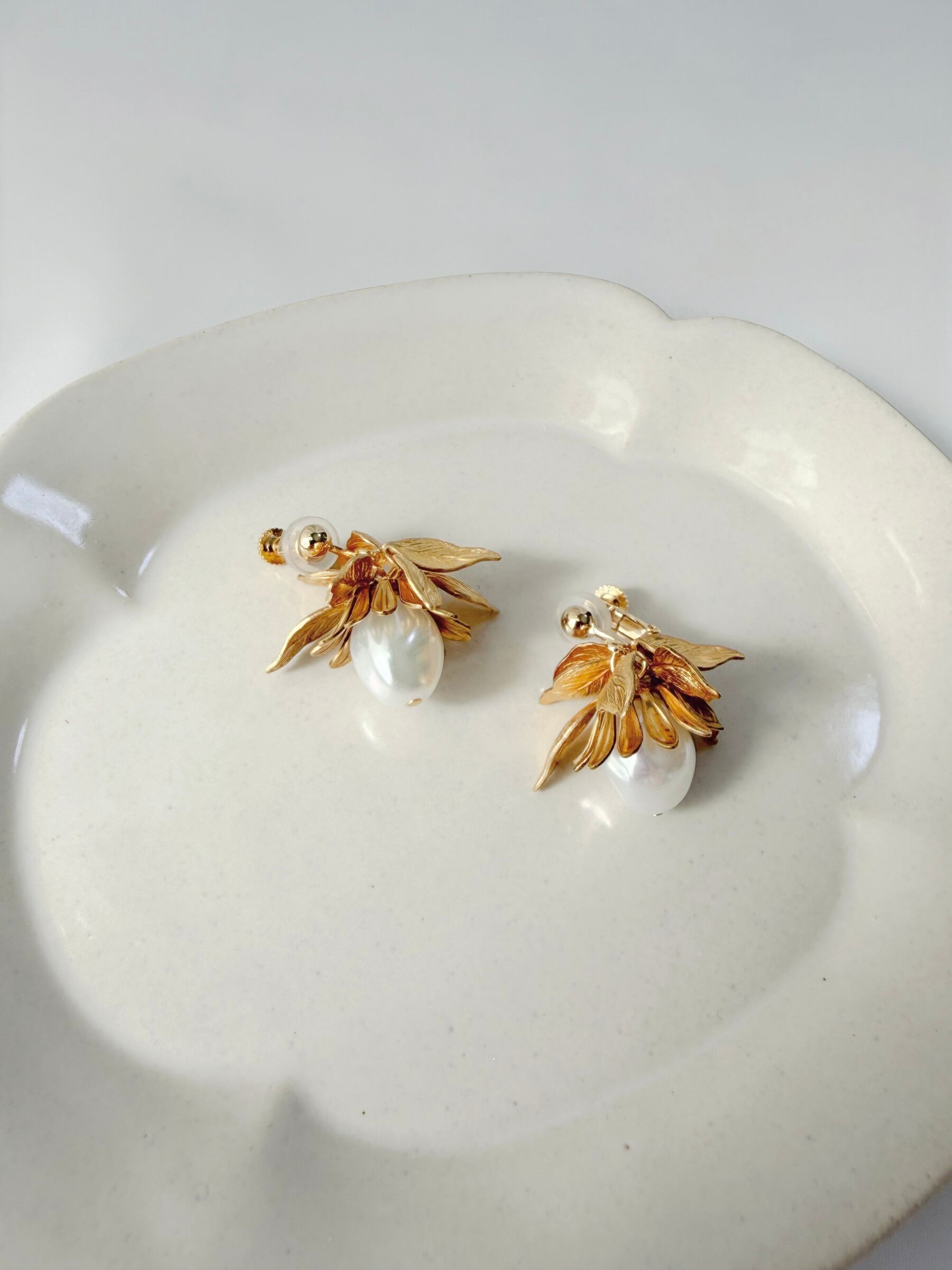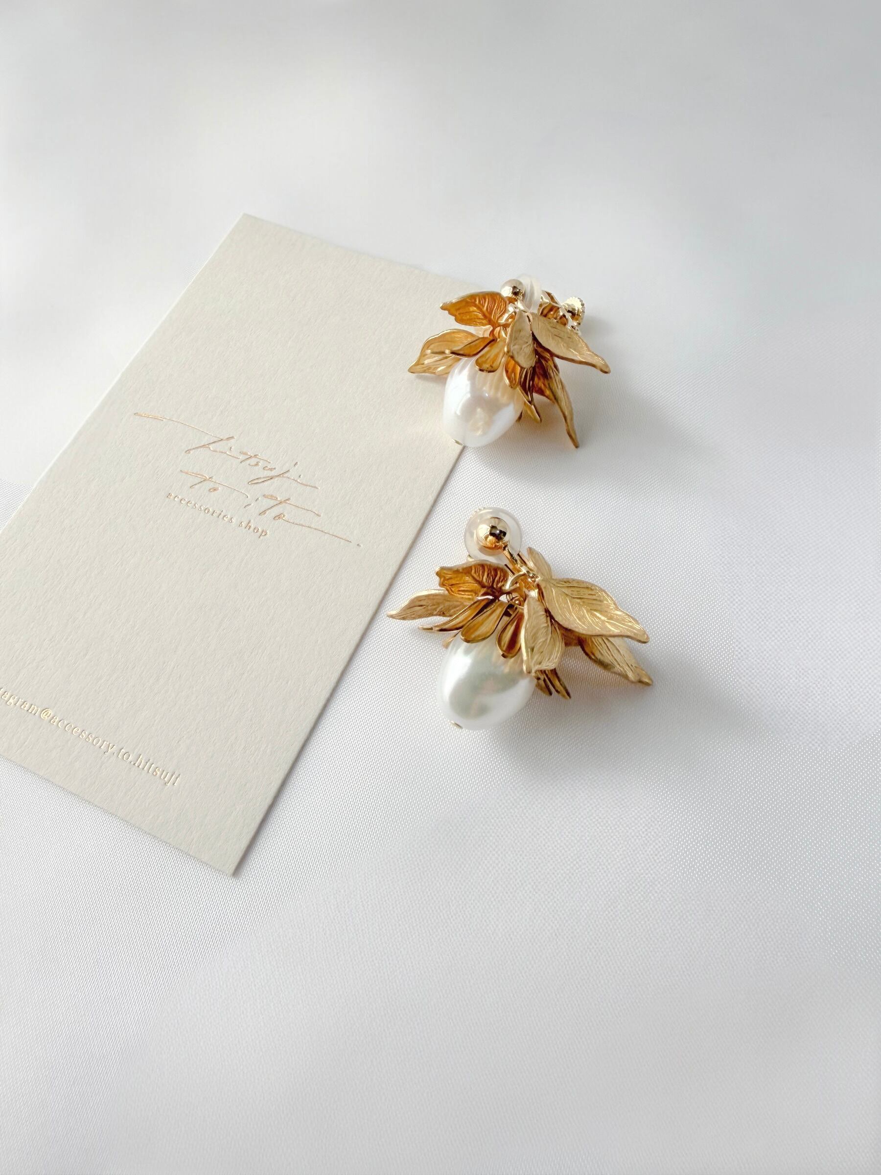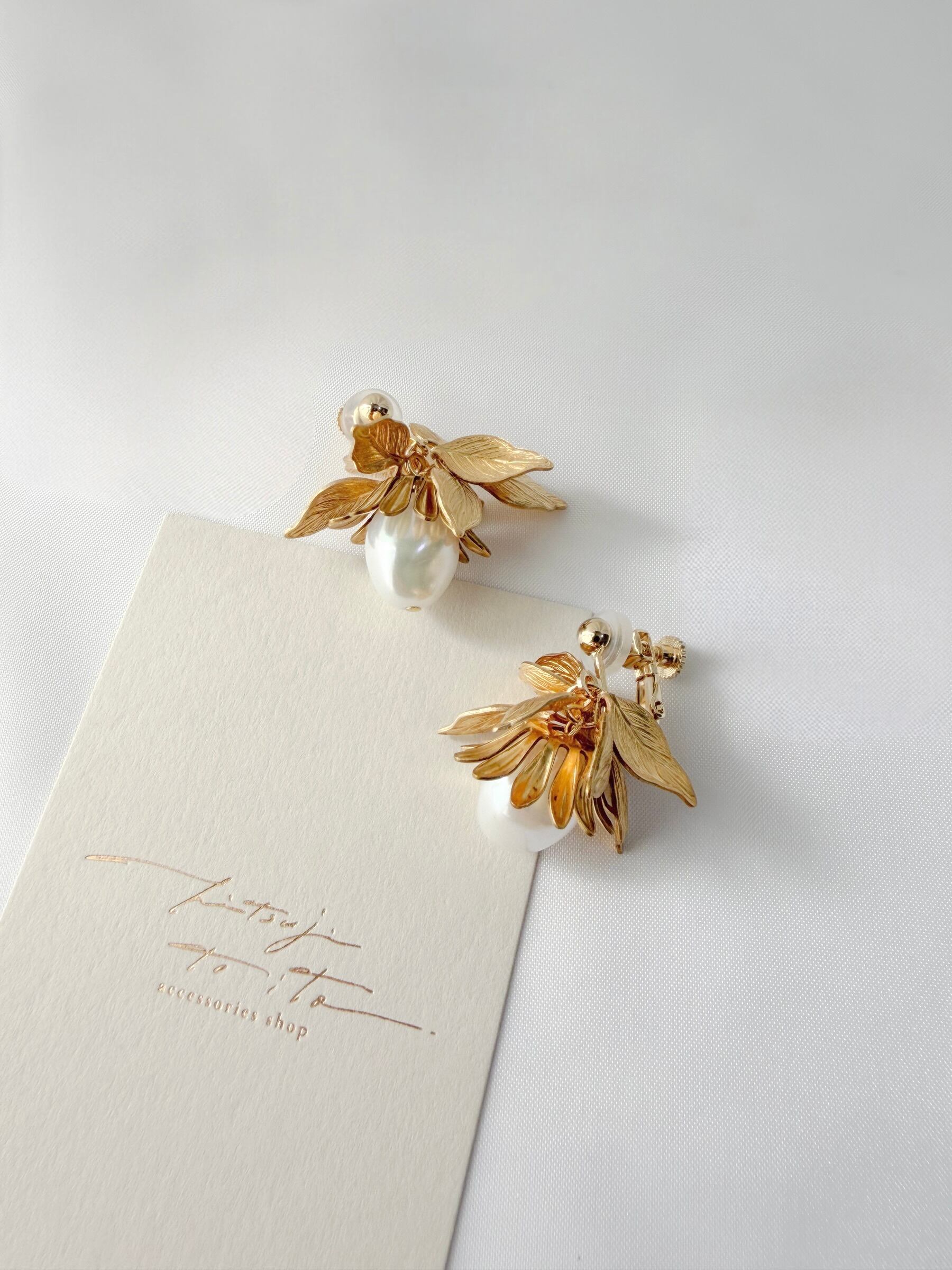 一粒のバロックパールと真鍮リーフをあしらったイヤリング。