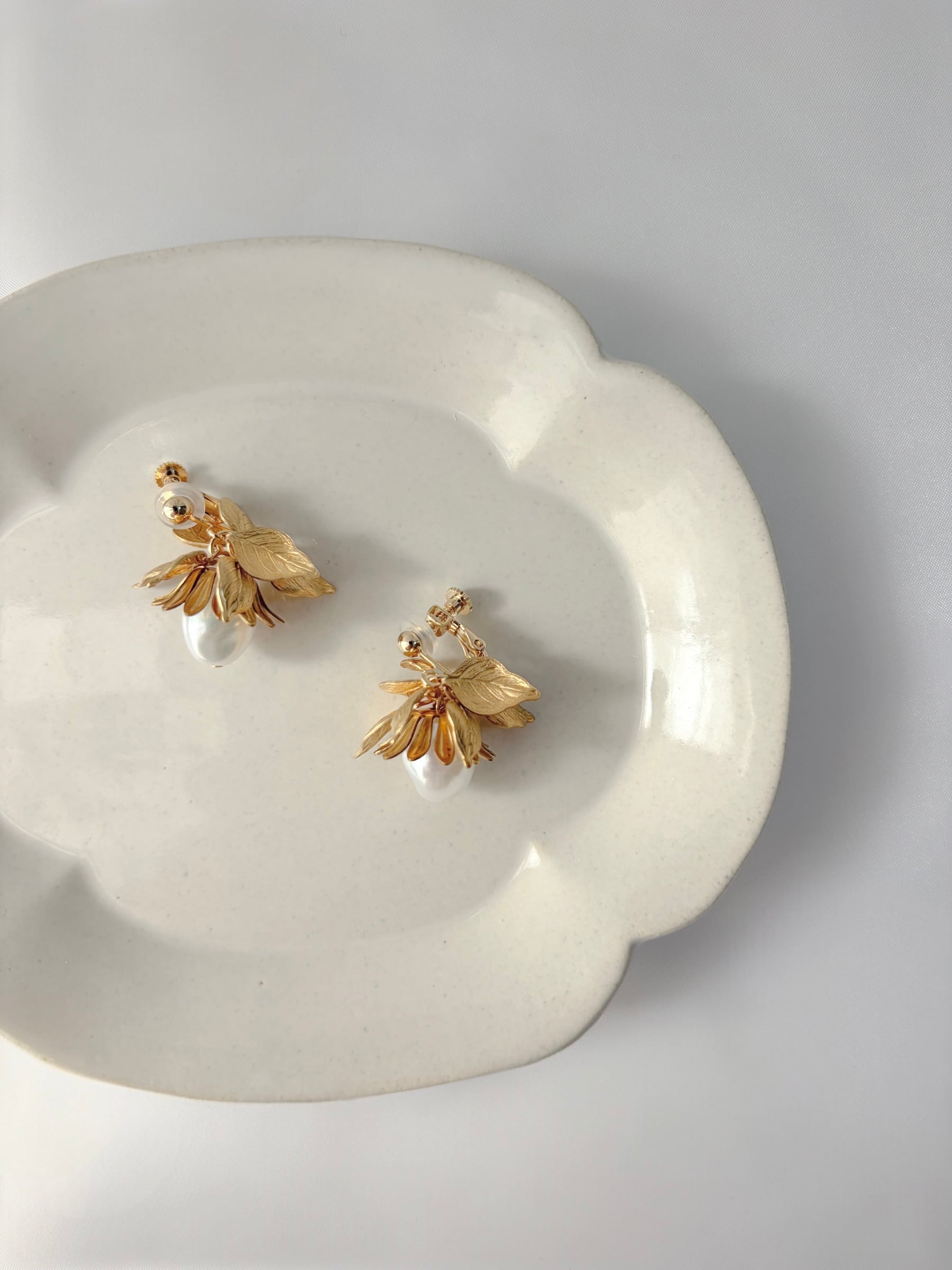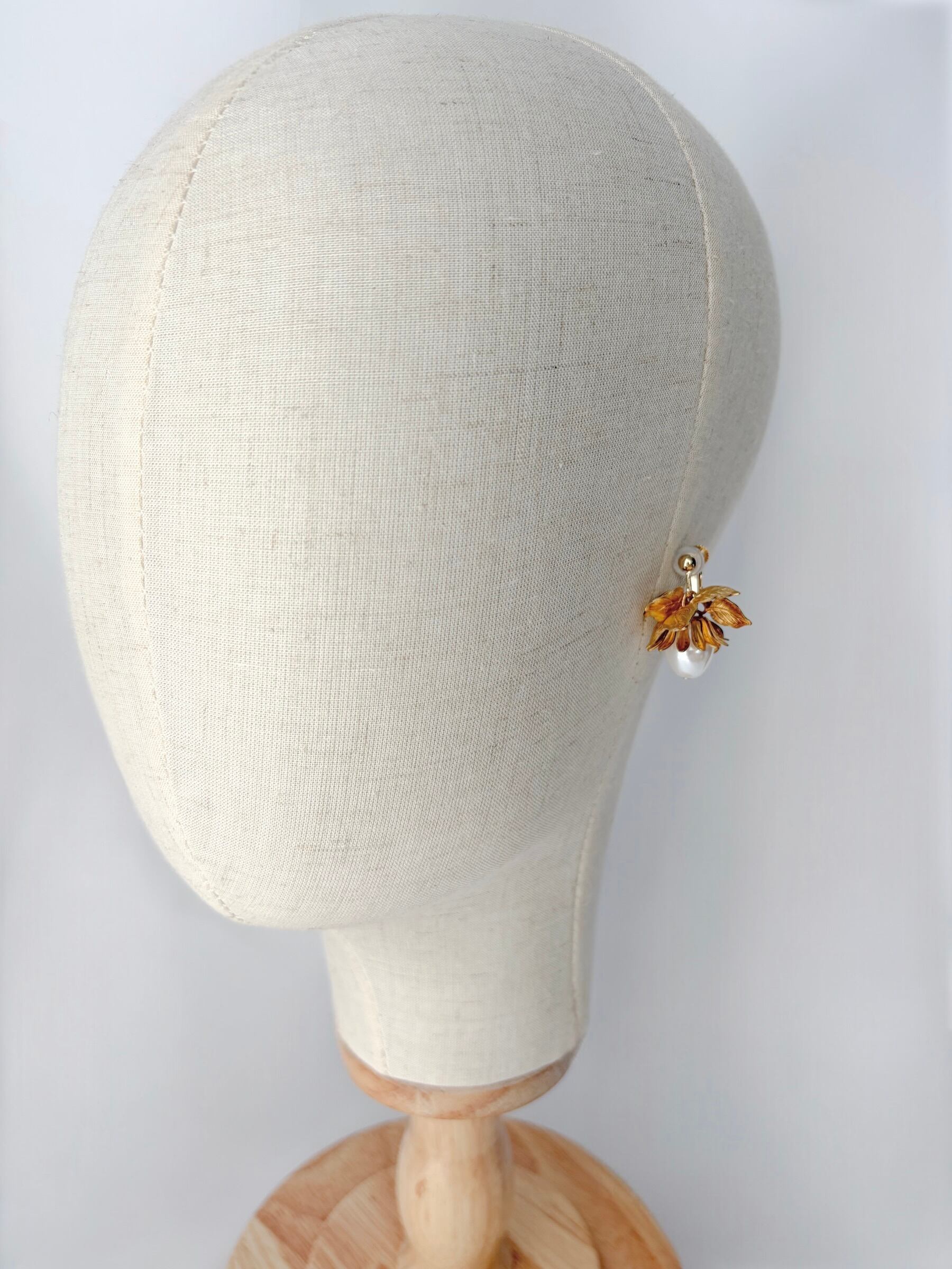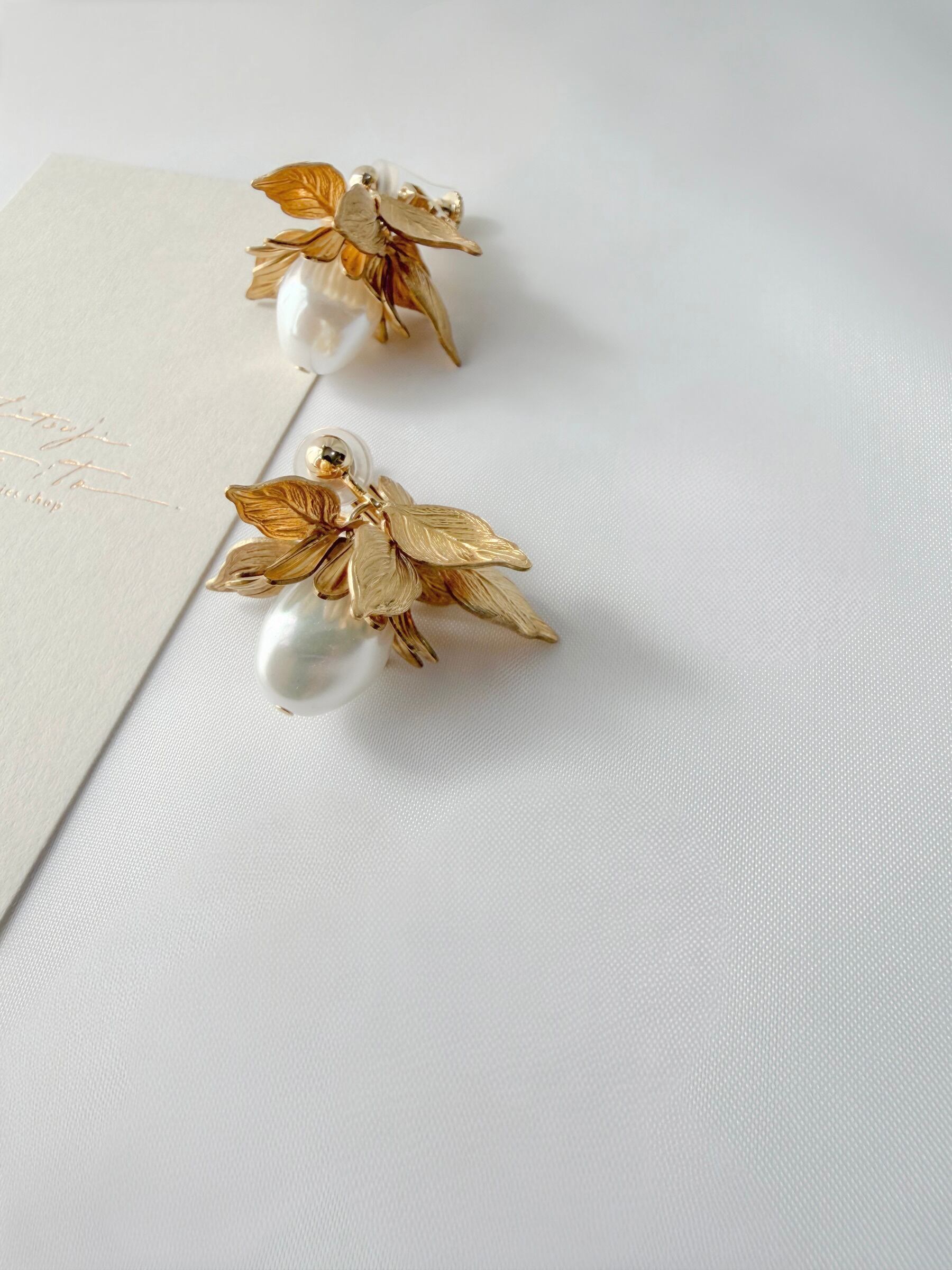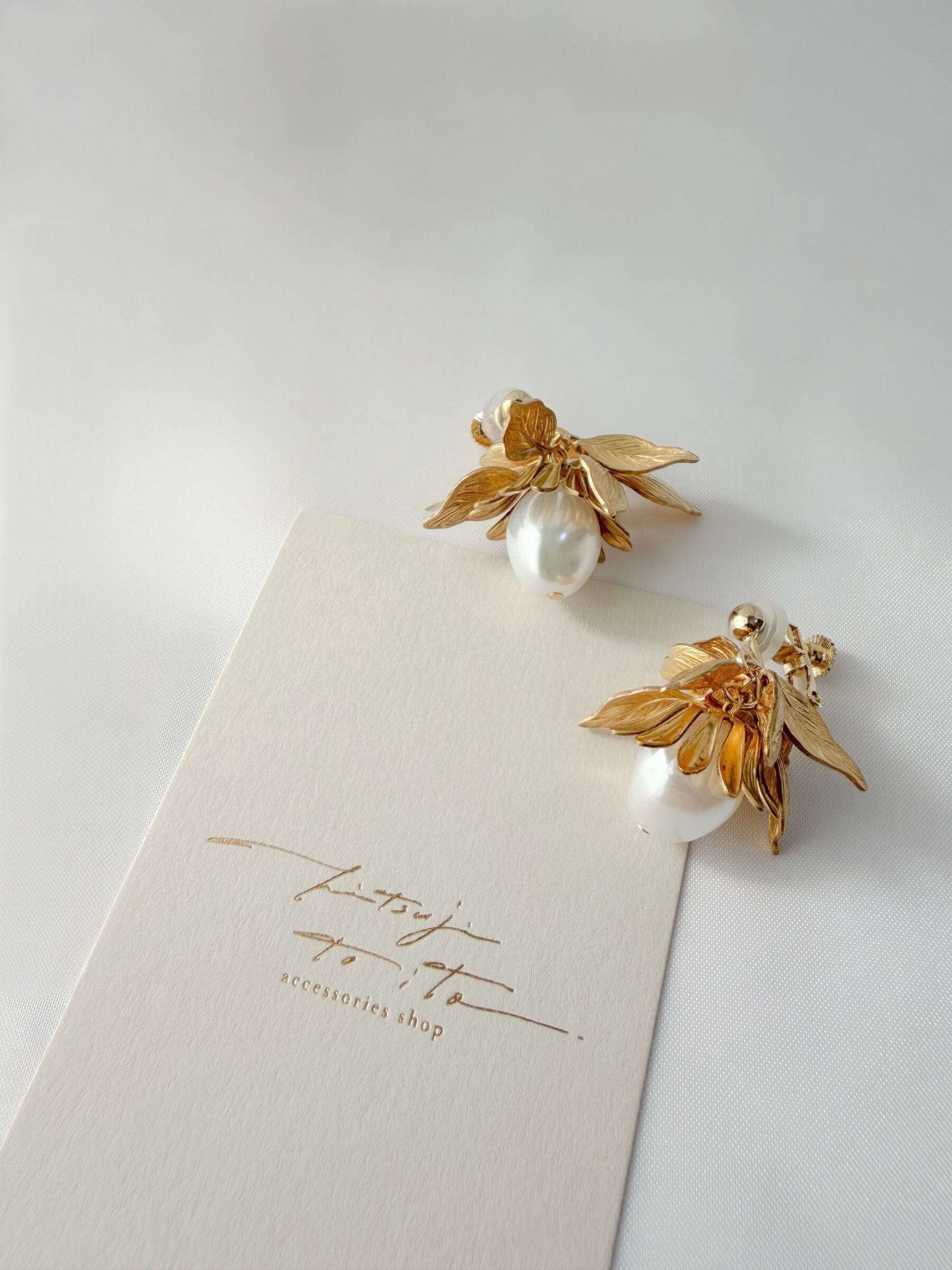 一粒のバロックパールと真鍮リーフをあしらったイヤリング。
