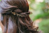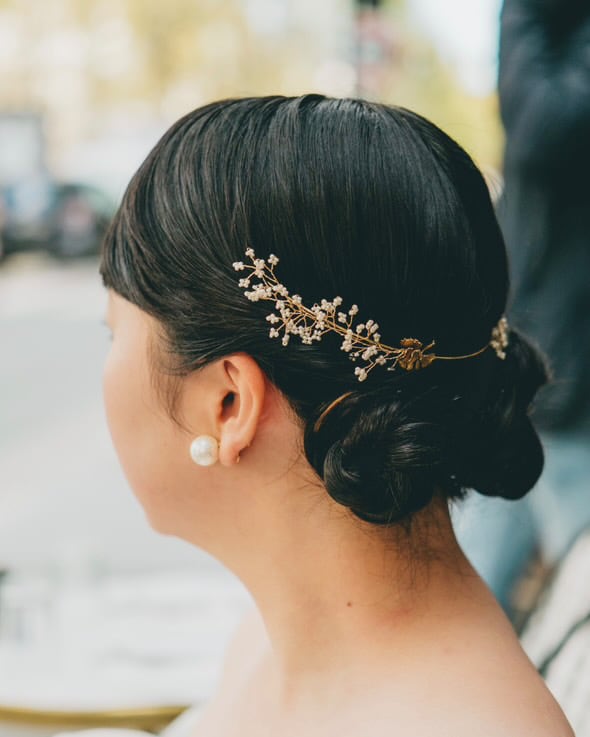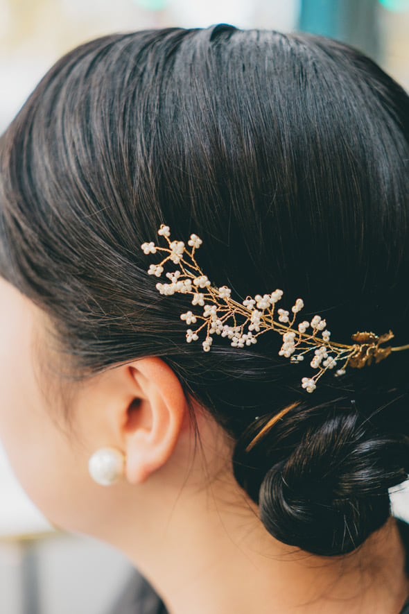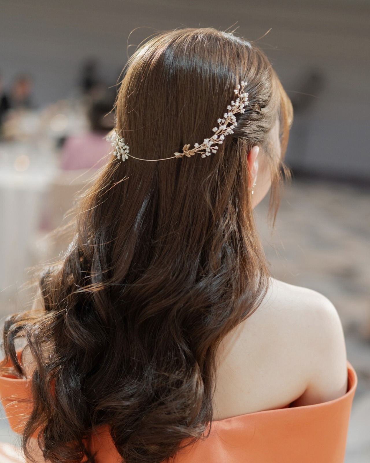 繊細で華奢な白小花と真鍮フラワーのカチューシャ。