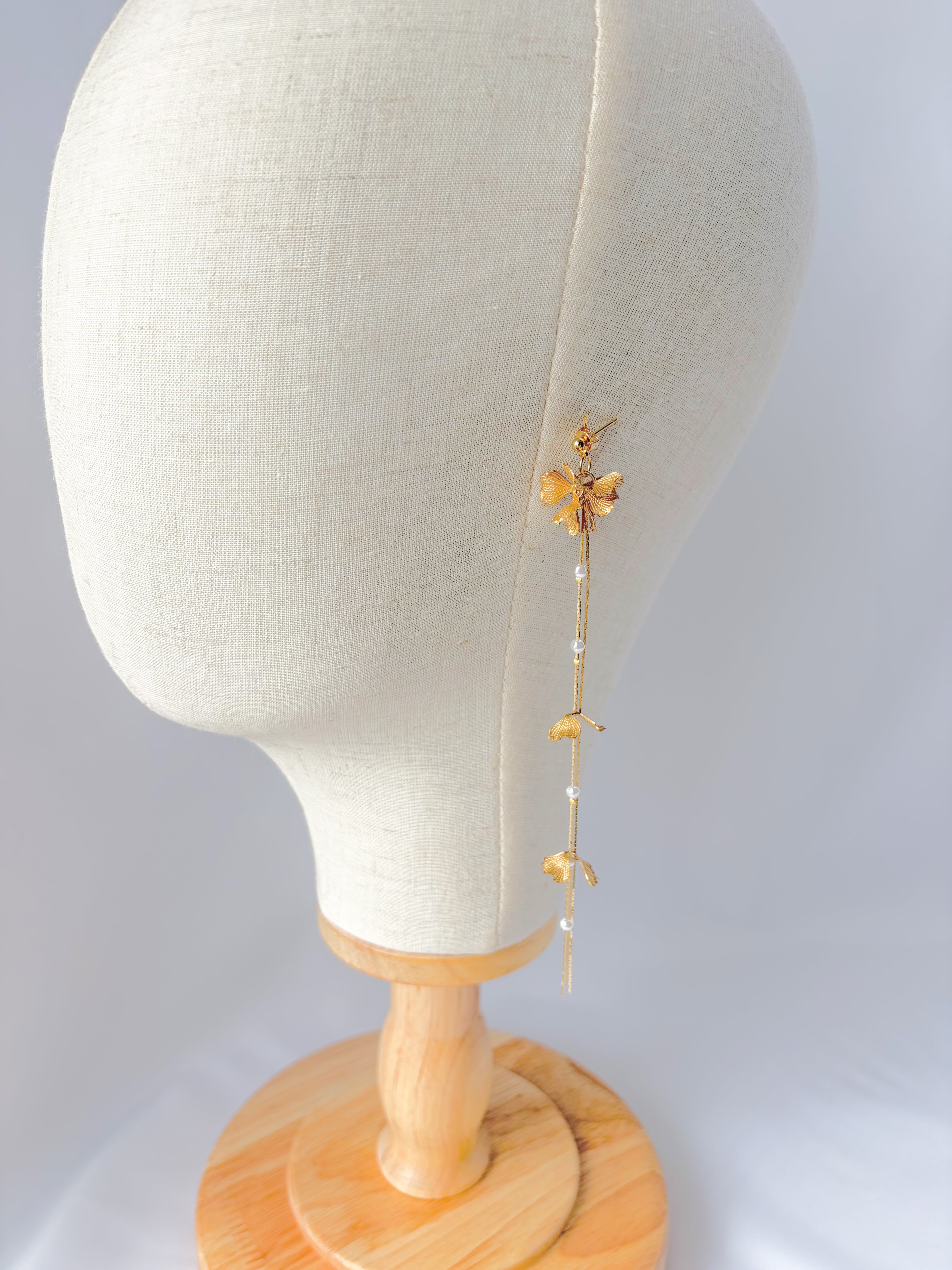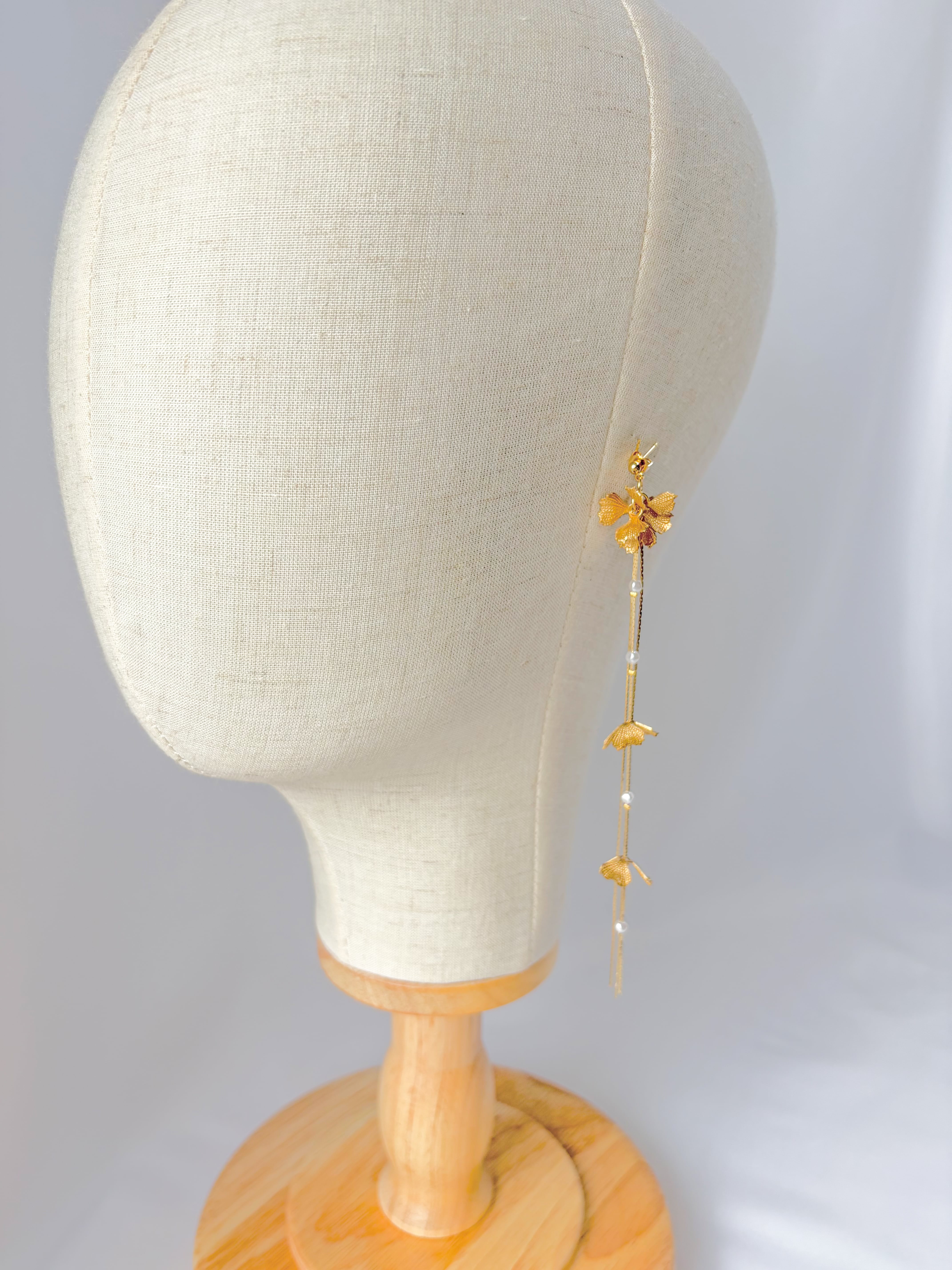 小花と小粒パール ゴールドチェーン イヤリング/ピアス